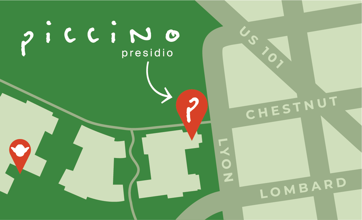 We are located in Building D of the Letterman Digital Arts Center, and our address is 1 Letterman Dr, Suite 150, San Francisco, CA, 94129. However, we know finding us can be a little tricky the first time so listed below are some different ways to get to Piccino Presidio.